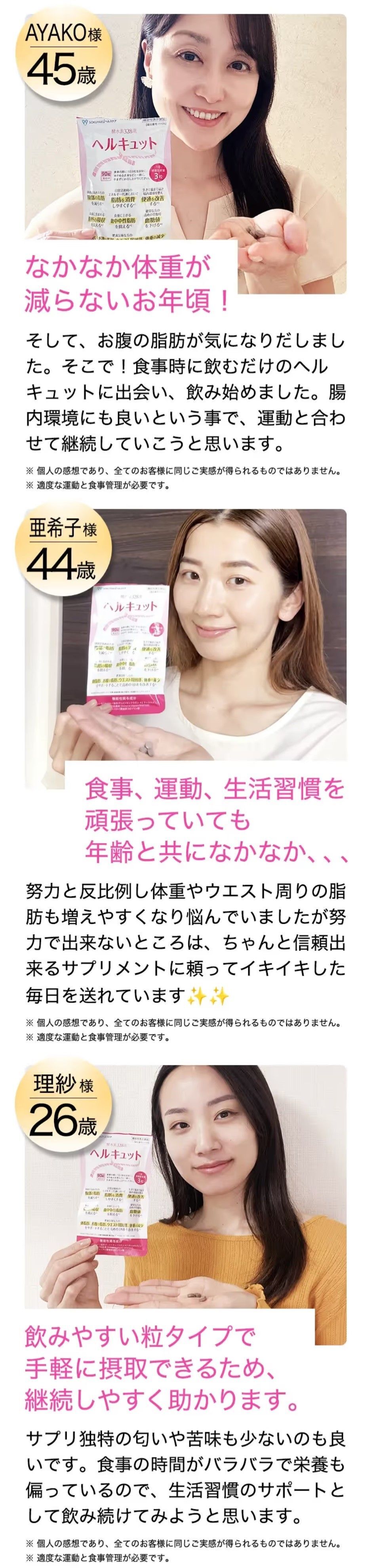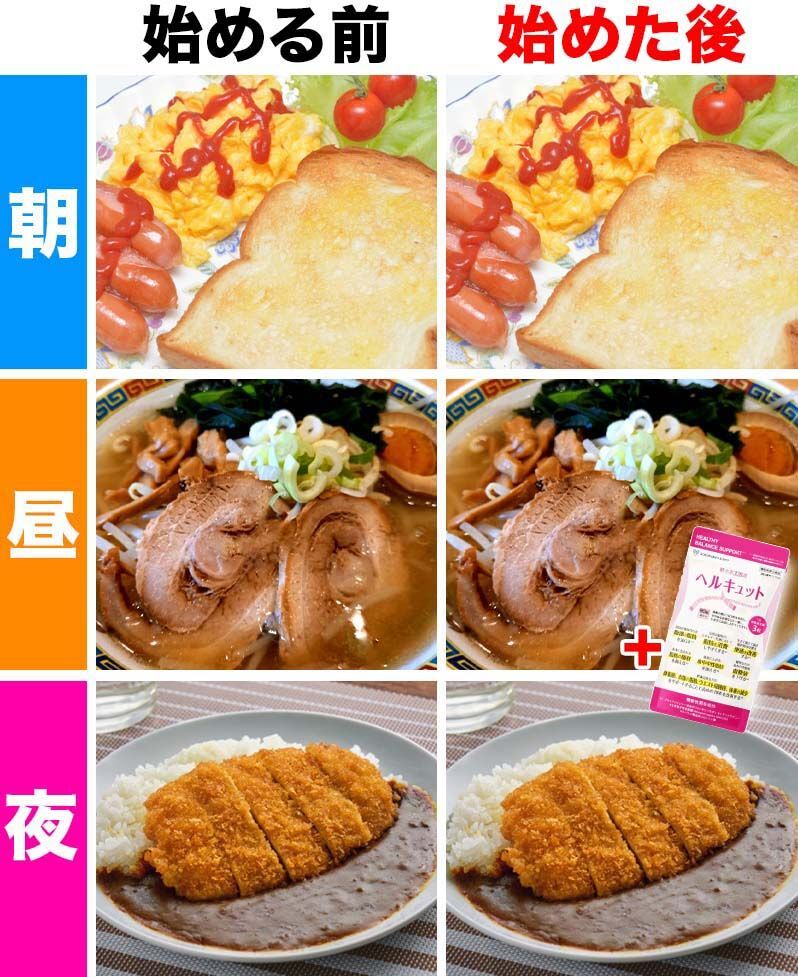 運動が苦手なのに食べることが大好きなので、もうどうしようもなかったんです…。でもヘルキュットは、脂肪を取り込まない・貯めない・分解と3つの作用があるので凄く感動しました!